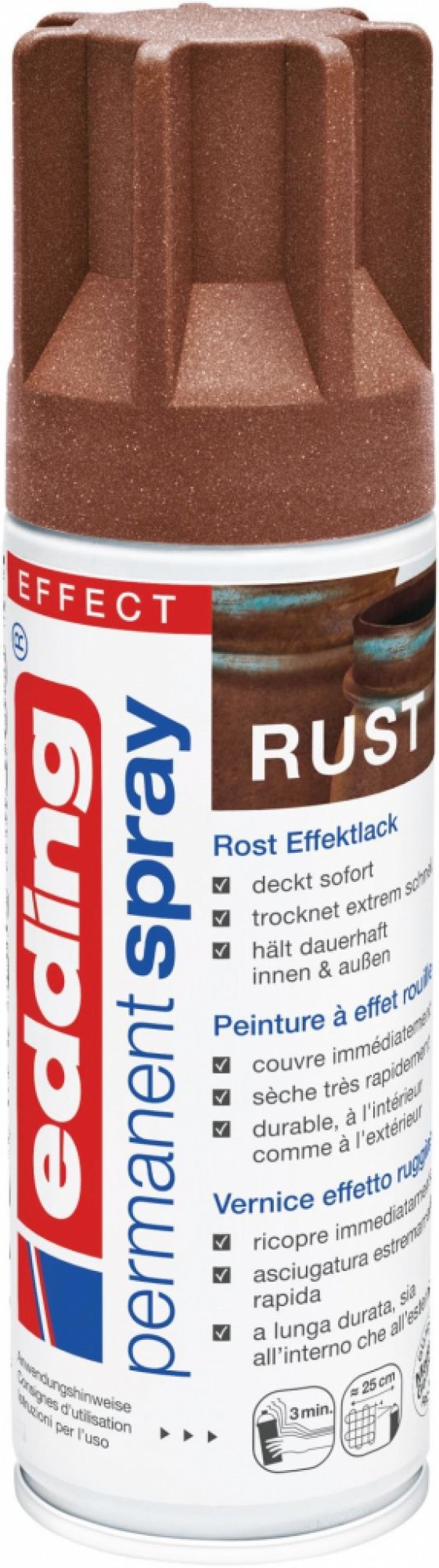 Vysoce kvalitní permanentní barva Edding 5200 s drsnou texturou a vizuálním vzhledem rzi s mimořádnou krycí schopností, extrémně rychle zasychá a je trvanlivá i v exteriéru.