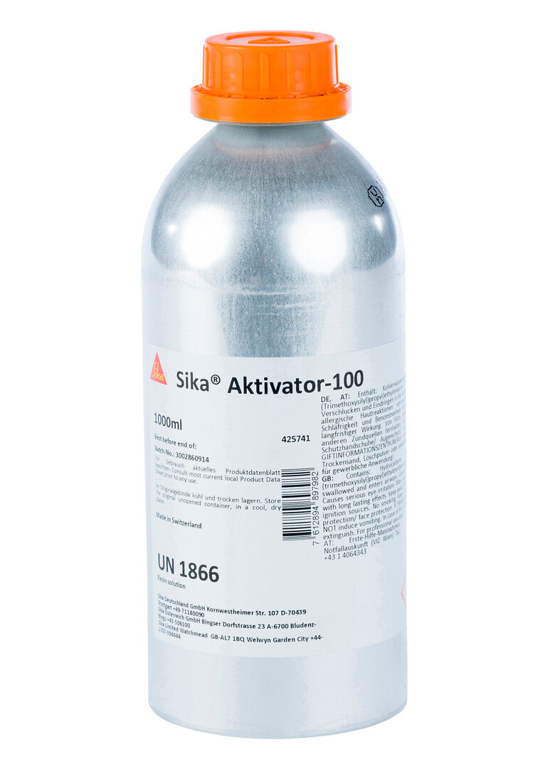 Sika® Aktivator-100 je bezbarvý aktivační prostředek, který reaguje s vlhkostí a vytváří tak aktivní vrstvu na povrchu podkladu. Tyto aktivní skupiny fungují jako spojení mezi substráty a základními nátěry nebo tmely / lepidly. Sika® Aktivator-100 je speciálně vyvinut pro ošetření lepených ploch před samotnou aplikací lepidel a tmelů Sika.