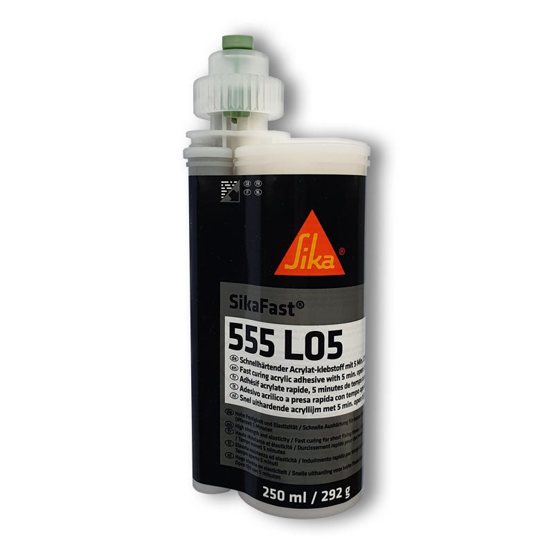 SikaFast 555 L05 je minutové akrylátové vysokopevnostní lepidlo s otevřeným časem 10min a pevností 11MPa. Je určen pro rychlé lepení a může nahradit nýty, šrouby nebo svařování. Je vhodný zejména pro konstrukční a montážní lepení na různé podklady včetně kovů, plastů, skla, dřeva atd.
